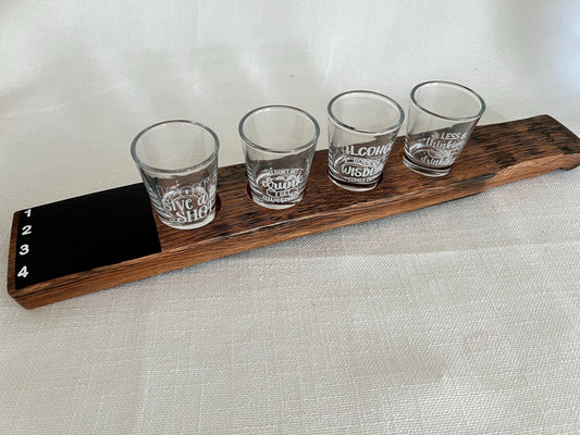 Shot Flight Board, whiskey barrel stave, 4 shots, Drink Flight Board w/ chalkboard and chalk including shot glasses